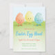 Um convite para Caça de Ovos de Páscoa com três, sorridentes, personagens de ovo de Páscoa. Os ovos amigáveis da Páscoa estão lá fora com grama verde. Todas as palavras do convite podem ser personalizadas.