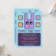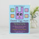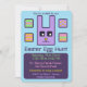 Um convite para uma caçada de ovos de Páscoa, com os detalhes de contato de local, data, hora e RSVP. Um coelho roxo feito de quadrados decora o design, com ovos quadrados coloridos e fundo azul-céu. As costas têm um padrão de coelhos e ovos.