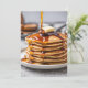 Grande pilha de panquecas com calda pingando e uma porção de manteiga para um convite de café da manhã de panquecas do Dia 4 de Julho.