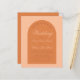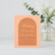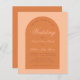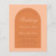 Um convite de casamento moderno. Tem um arco cor de laranja com texto. A palavra Casamento e os nomes são escritos em um roteiro caligráfico elegante, a primeira linha é um texto arquivado.