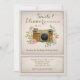 Um convite nostálgico com uma câmera vintage embelezada com flores e folhagem. (FP)