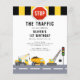 Um convite de festas de primeiro aniversario com caminhões de construção. O convite pode ser personalizado com a inclusão do nome e dos detalhes da sua pequena festa. O design apresenta caminhões de construção de aquarelas bonitos e é ideal para qualquer pequeno que ame seus caminhões.