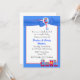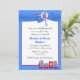 O convite para o chá de fraldas na moda é feito em azul, vermelho, amarelo, verde e branco. Decorado com gráficos doces de um trem colorido de brinquedo, no fundo, e um chocalho de bebê decorando uma fita e um arco azuis, no topo. Personalize o texto preto e azul para atender às necessidades do seu chá. Um convite bonito para os pais serem amados.