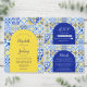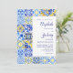 Este design rústico apresenta um padrão de fundo de azulejos portugueses de cor d'água azul, branca e amarela. Personalize-o com os nomes da noiva e do noivo em script de caligrafia azul-marinho e o texto restante em uma combinação de sans serif, copperplate e itálico em um retângulo branco alinhado com a borda direita da placa. Um padrão de azulejo correspondente aparece no lado oposto.