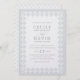 Elegante e formal em tons de cinza de prata pálida e branca, nosso convite para o casamento árabe tem uma sensação quica de marroquino com uma fronteira geométrica inspirada pelo Moorish, ao redor de seus detalhes de casamento em letras sérvias e sans serif tradicionais. Recomendamos a impressão deste convite no papel Luxe Pearl Shimmer para um acabamento luxo e macio metálico.