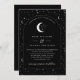 Uma lua celestial e um convite de casamento estrelado com um fundo negro e um texto branco com elementos. Você também pode adicionar sua própria foto no verso. Personalize a cor do padrão estelar, fundo, preenchimento de arco e elemento lua!