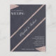 Um design geométrico contemporâneo com formas de rosa-ouro. Um efeito de mármore nas formas cor-de-rosa adiciona um toque de elegância. Com uma combinação de fontes modernas e um roteiro elegante de casamento para os nomes da noiva e do noivo. Uma cinza azul escura e texturizada dá a isto um olhar exclusivo. Fácil personalização para o seu casamento moderno. O reverso modelou formas em mármore cor-de-rosa e rosa que complementa a frente.