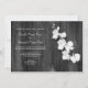Um convite de casamento com uma imagem de fundo preto e branco de orquídeas brancas sobre o lenhador. Personalize com detalhes da sua ocasião à esquerda. A redação é de noiva e noivo junto com seus pais.