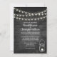 Convites de casamento de madeira russa em carvão preto apresentam fundo de foto de madeira, luzes cintilantes de cordas e jarro de pedras com uma vela. Misturar e combinar este convite de casamento com a nossa coleção de papelaria de casamento e favores.