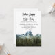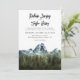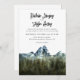 Cartão de convite de casamento para o tema da montanha russa, com ilustração de uma montanha azul com floresta de pinheiros.