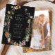 Este convite de casamento na moda e elegante apresenta lindas flores silvestres de cor d'água pintadas manualmente, organizadas como uma bela coroa perfeita para primavera, verão ou casamentos outono. O verso inclui uma foto de noivado para personalização. Encontre itens correspondentes na Coleção de Casamentos de Flor Selvagem Moody Black Boho.