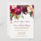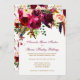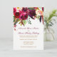Este belo convite para o casamento de cor-de-água entorpecida floral e penas apresenta burgundy, crimson, beringela, rosas de creme ou flores do tipo peônico com folhas verdes e ramos em tons de verde-oliva, ferrugem, laranja queimada e marrom, juntamente com penas coloridas sorvidas em laranja, roxo, cinza e preto. O texto personalizável está em uma paleta de cores dourada e arrojada e o dorso tem um padrão de buquês nas mesmas cores.