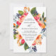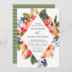 Um convite de casamento floral personalizável que inclui flores, folhagem e laranjas aquáticas. Este convite de casamento botânico é perfeito para casamentos de primavera e verão.