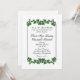 Um belo convite branco com fronteiras de folhas verdes. Coloque os primeiros nomes do casal de um lado com todas as informações do casamento e saudação da mãe e do pai da noiva. Por favor, verifique triplicamente todo o seu texto.