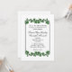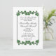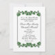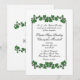 Um belo convite branco com fronteiras de folhas verdes. Coloque os primeiros nomes do casal de um lado com todas as informações do casamento e saudação da mãe e do pai da noiva. Por favor, verifique triplicamente todo o seu texto.