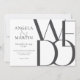 Os convites para casamento simples, mas ousados, de 7 x 5" contêm as palavras, "Nós fazemos", em letras pretas de tamanho excessivo, em um fundo neutro, com texto de titular de cinza preto e leve para os nomes dos primeiros casais de casamento, data, hora, local, endereço do local com a mensagem na parte inferior, "recepção a seguir."