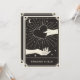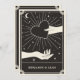 Este convite de casamento Boho apresenta um design de estilo carta tarot celestial em uma paleta de cores preta e creme. A ilustração mostra uma mão segurando um coração. O fundo tem uma lua e estrelas cintilantes. Isso seria perfeito para qualquer um que tivesse um casamento temático de Halloween ou Spooky com um tema de palmica ou fortuna.