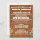 Fundo de Madeira Marrom texturizada com Letras Brancas Negrito e flores brancas. Adicione seus detalhes de casamento para um convite de casamento gentil.