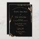 O texto Dourado em duas fontes contrastantes é contra um fundo preto que apresenta o fofocinho sábio ouro chamas oscilando em torno de cantos alternativos. O texto está alinhado para que você possa digitar suas informações pessoais sobre o evento de casamento. Os nomes dos casais e algumas outras linhas estão em uma fonte elegante de script, enquanto o restante é uma fonte compacta sans serif. Ele apresenta a frase popular "Junto com seus pais."