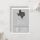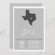 Uma Cinza Elegante e um convite de casamento branco, com uma cinza da silhueta do Texas com coração. A parte de trás do convite tem um design de impressão simples.