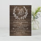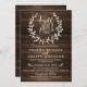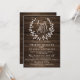 Cartão Rustic Wood Faith. Este convite para o casamento tem um fundo de madeira rústico e uma linda coroa verde na frente com as palavras Faith, Hope & Love de 1 Corinthians 13. Este design é perfeito para o seu casamento cristão.