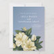 Elegante convite de casamento botânico com os detalhes do seu casamento na frente e no centro com buquês de flores pintadas de jardinia branca, prendas de fôlego de bebê, folhas verdes de sage e folhas verdes vibrantes nos cantos. Este convite de casamento floral branco é perfeito para casamentos de jardim e casamentos de primavera ou de verão. Se precisar de ajuda ou de itens correspondentes, entre em contato comigo.