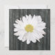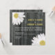 Um convite de casamento com uma foto de fundo de madeira de celeiro. Antiguidade inspirou fotos de margaridas nos cantos superior esquerdo e inferior direito. Personalize o texto correspondente com detalhes do evento. A margarida do solteiro de trás no centro sobre o fundo do celeiro.