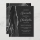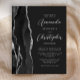 A borda esquerda deste elegante convite de casamento moderno apresenta uma coloração aquosa preta e borda agitada com falso brilho prateado. O texto personalizável combina fontes de script e sans serif em cinzas prateadas claras em um fundo preto de slate. O verso apresenta um design de agata preto e prateado correspondente.