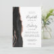 A borda esquerda deste elegante convite de casamento moderno apresenta uma coloração aquosa preta, borda agitada, aparada com falso rosa dourado. O texto personalizável combina manuscrito, copperplate e fontes itálicas em cinzas de carvão em um fundo branco. O verso apresenta um design de agate preto e rosa dourado correspondente.