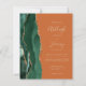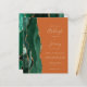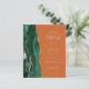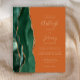 A borda esquerda deste elegante convite de casamento moderno apresenta uma esmeralda verde aquarela agate borda com falsa brilho dourado. O texto personalizável combina manuscrito dourado, fontes em copperplate e itálico em um fundo laranja queimado ou robusto. O verso apresenta um design emerald verde e dourado.