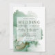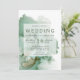 Convite de casamento interessante e moderno com um fundo de tinta verde de álcool esmeraldo com sutis pingos de ouro. Seus detalhes estão sobrepostos em um quadrado branco transparente.