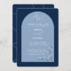 Convocação para Casamento de Matizes Azuis Modernos. Matiz azul com arco. Fontes de script e serif. Flores brancas e texto branco. O dorso tem linhas de azul claro. Design moderna e minimalista. Personalize com seus detalhes de casamento.