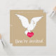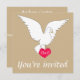 Este belo convite para o casamento mostra uma pomba branca num lindo fundo de areia que é uma bela aparência para um casamento. A pomba também se prende a um amor vermelho ouvido que tem iniciais que podem ser personalizadas para serem as iniciais da noiva e do noivo e é um toque romântico na frente do convite. A parte de trás do convite é um simples fundo colorido de areia com todos os detalhes do evento feliz em escrevendo branco.