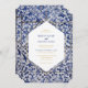 Este design apresenta padrões azulejos portugueses russos. O texto do casamento é elegantemente enquadrado com uma forma geométrica branca e dourada. Design de convite para casamento floral único Azulejo azul e branco com elementos modernos. Também estão disponíveis itens de papelaria de casamento e outros formatos de convite de casamento.