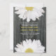 Um simples convite de casamento com margaridas saindo de cima e de baixo. O fundo é barnwood. Personalize o texto correspondente no centro com detalhes do casamento. O lado oposto apresenta um plano de fundo de madeira de barro correspondente. Personalize com os nomes da noiva e do noivo sobre o monograma. Papel do Reciclado.