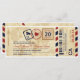 Um convite de casamento inspirado no cartão de embarque em tons de marrom claro, azul marinho e vermelho escuro. Personalização com seus nomes e informações de casamento!