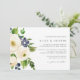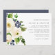 Nosso convite para o casamento do Blueberry Lane mostra seus detalhes do casamento alinhados à direita, acentuados por flores de aquarela de indigo e marfim, mirtilos e folhagem verde.