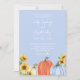 Anuncie sua comemoração de outono em estilo com nosso encantador convite para casamento de girassol de outono. Contra um fundo azul claro e macio que lembra os céus claros do outono, os girassóis vibrantes florescem com esplendor de ouros, complementados por abóboras brancas, de bebê branco e laranja anjadas no fundo. Esta composição encantadora captura a essência da colheita da estação e o calor da sua história de amor. Feito com detalhe meticuloso, o convite apresenta uma tipografia elegante que acrescenta um toque de sofisticação. Quer você esteja planejando um caso rústico ao ar livre ou uma reunião íntima no interior, este convite define o tom perfeito para seu dia especial. Abrace a beleza do outono e convide seus entes queridos a se juntarem à alegria com um convite que reflete o charme e o espírito da estação.