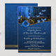 Um convite elegante para o casamento, com uma floresta encantada com luzes festivas de fadas e borboletas em azul-da-noite.