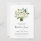 Os convites para casamentos florais elegantes apresentam um buquê de rosas brancas de aquarela e peônias com folhas e folhagem botânica verde-esbranquiçada. Personalize com seus detalhes de casamento abaixo em uma mistura de blocos, serifas e tipos de caligrafia manuscritos.
