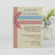 O convite para casamento, feito em fundo bronzeado, com fitas de gingham vermelhas e azuis. Personalize o texto em estilo de fonte, cores e tamanho.