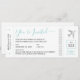 Um convite que se parece com um cartão de passagem de avião com um logotipo de avião romântico simples e moderno e fontes elegantes em azul água turquesa e prata, perfeito para um casamento no destino para o qual os convidados viajarão, um casamento no exterior ou para uma viagem casamento temático para um casal que tem grande desejo de viajar e senso de aventura ou que se conheceu enquanto viajava ou trabalhava internacionalmente.