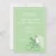 Divertido e moderno, este convite de casamento de na moda apresenta a silhueta de casal mais bonita de uma bicicleta, junto com um fundo verde de massa. A menina está vestindo um belo véu que sai da página. Este convite de casamento é perfeito para o seu dia especial. cartões salve a data correspondentes, cartões de resposta, postagem e muito mais, além de outras opções de cores, estão disponíveis em nosso compro.