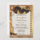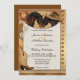 Convite de casamento no estilo country e ocidental com dois cavalos, ferraduras e botas de cowboy sobre um fundo branco de madeira intacta com uma armação de xadrez e metal de cobre dourado. Este convite tem uma placa RSVP correspondente.