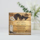 Convite de casamento com dois cavalos românticos, uma bota de vaqueiro, sapatos de cavalo, flores de margarida e um chapéu. O fundo é um painel de madeira rústico com rendas. Linda para uma celebração country e amantes de cavalos. Este convite tem uma placa RSVP correspondente.