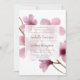 O convite para o casamento floral elegante e moderno apresenta um fundo de flores floridas de cereja cor-de-água rosa e macia. Seus detalhes de casamento estão sobrepostos em um elemento branco em letras de cinzas elegantes acentuadas com escrita de caligrafia manual.