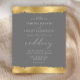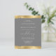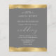 Este elegante convite de casamento apresenta um design de borda dourada falso, rasgada nas bordas superior e inferior, em um fundo de cinza. A palavra "casamento" aparece em escrita caligráfica. Personalize o texto branco com os nomes da noiva e do noivo e os detalhes do casamento. O design dourado é repetido no reverso.