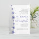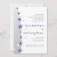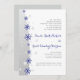 Convite de casamento de cinza branca e azul. Mostra uma banda ondulada em cinzas prateadas com estrelas e flocos de neve elegantes azuis. Texto em azul. Um design de na moda perfeito para o seu casamento de inverno, dezembro ou Natal.