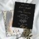 Design moderno e sofisticado, com elegante caligrafia em branco e ouro sobre fundo preto. No verso há espaço para adicionar sua foto de casais favorita e seu monograma. Personalize com seus próprios detalhes.