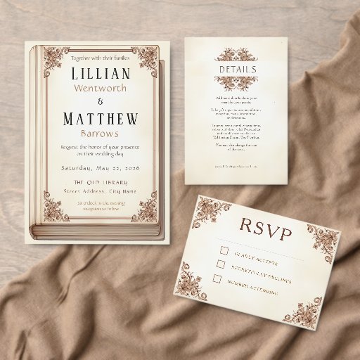 Este convite de casamento para o livro de bibliotecas de vintage foi feito para se parecer com um cobrir de livros de vintage com elementos elegantes de fronteira ornamental dando-lhe uma elegância eterno refinada de um antigo cobrir de livro. Este convite dá o tom perfeito para amantes literários embarcando juntos na sua próxima aventura de excelente. Faça do dia do seu casamento um folheto de página com o nosso Convite de Casamento de Cobrir da Biblioteca Vintage, um prelúdio perfeito para o seu feliz futuro.